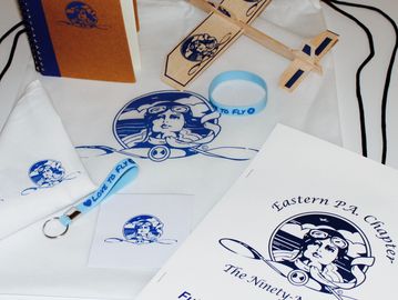 Everything for the aspiring young pilot including activity booklet, notebook, bandana, bracelet, keychain, sticker, and balsa airplane in a string backpack.