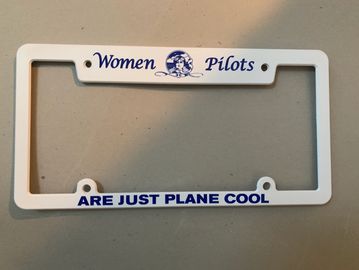 Plastic license plate holder that reads "Women Pilots Are Just Plane Cool"